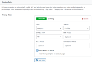 Pricing rules let you automatically enable Name Your Price and apply minimum, maximum, and suggested prices based on a product’s category, tag, or the current customer’s user role — without editing individual products.