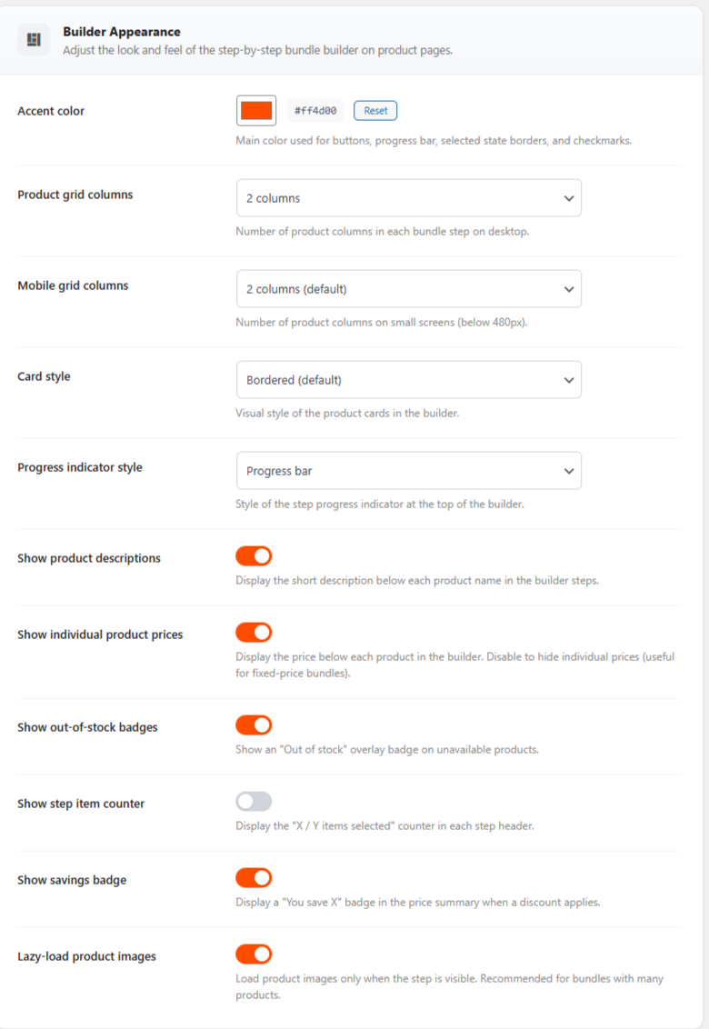 • Show or hide product descriptions, individual prices, stock badges, step counters, savings badges, and lazy-loaded images