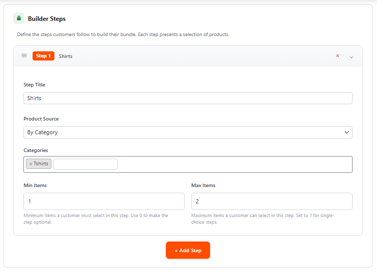 4. Add bundle steps, choose a product source (category or hand-picked), and set min/max quantities for each step.