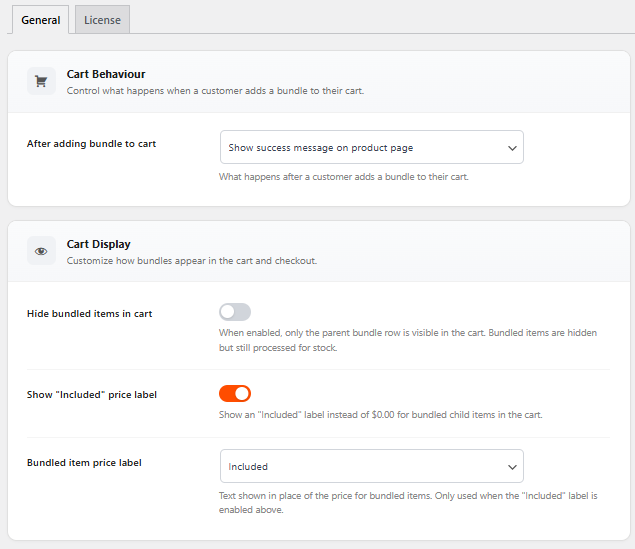 • Configurable child item visibility — hide bundled items in the cart or show them with customizable labels (Included, Bundled, Part of bundle)