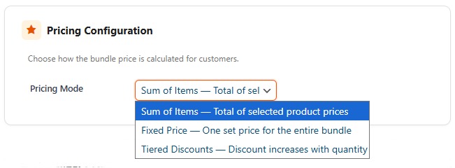 5. Select a pricing mode — fixed, sum of items, or tiered discounts — and configure pricing rules.